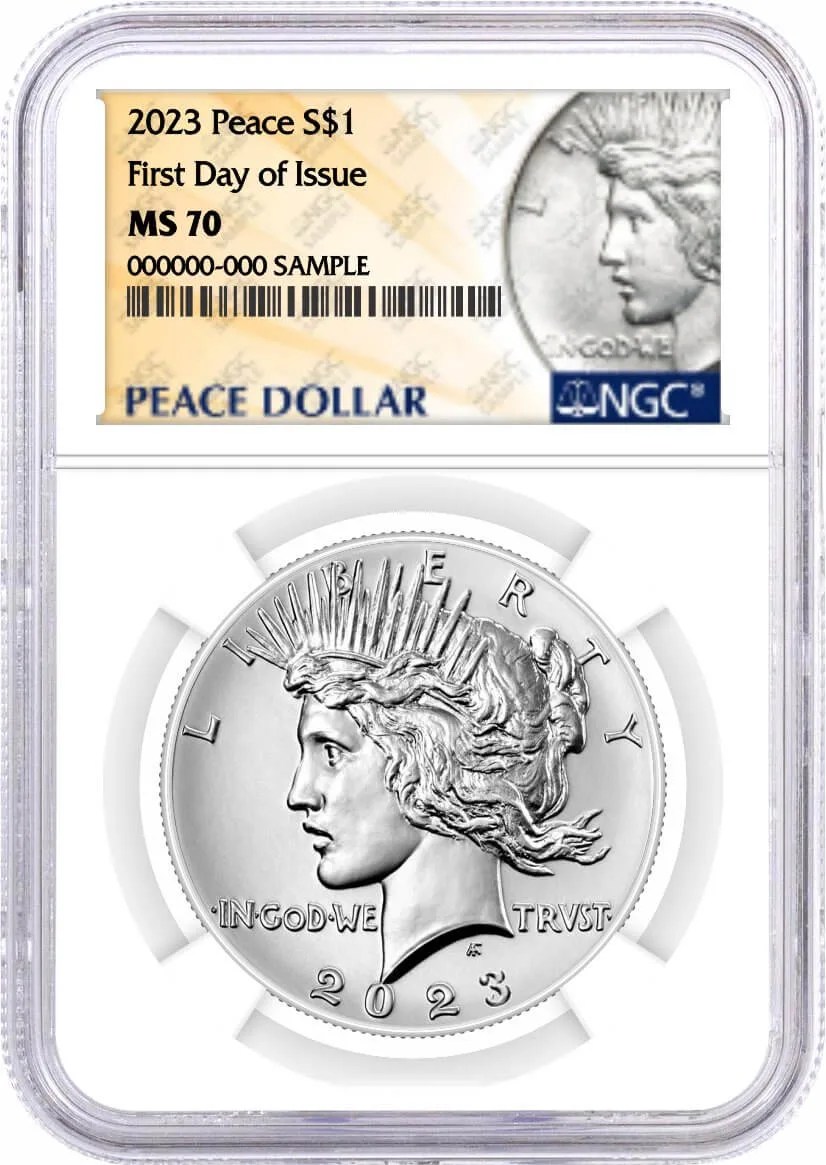 Both Uncirculated Morgan and Peace Dollars are struck in 0.858 troy ounces of .999 fine silver and certified First Day of Issue by NGC in perfect MS70 condition, featuring the FDI Design Label. These coins were also struck in Philadelphia; however, they do not display a mint mark.
