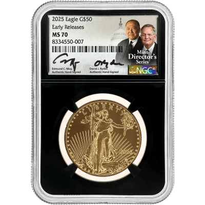 Own numismatic perfection with this 2025 $50 American Gold Eagle certified MS70 by NGC—the highest possible grade. This flawless 1 oz gold coin features the prestigious Ryder/Moy Dual Signature and comes encapsulated in NGC’s exclusive Black Core holder with Early Release designation.
